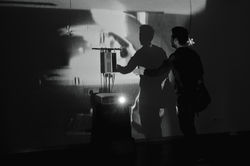 Его фокус - противопоставление black box студий внутри театра, наполненных темными звуками, с серебристыми светящимися Белыми ночами Санкт-Петербурга - вне Театра.