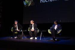 Спектакль играется в камерном пространстве Медиацентра при участии маститого Сергея Паршина и его более молодых коллег Дмитрия Бутеева и Леонида Таранова.